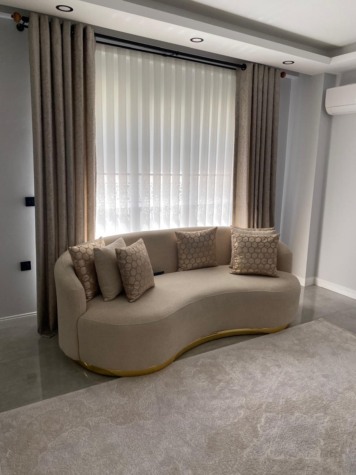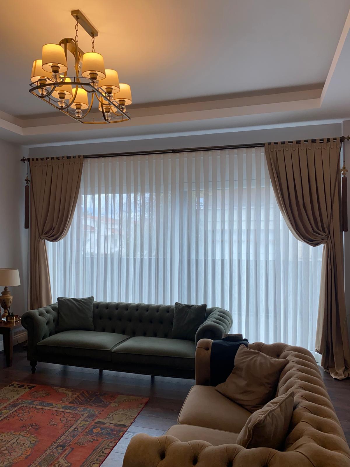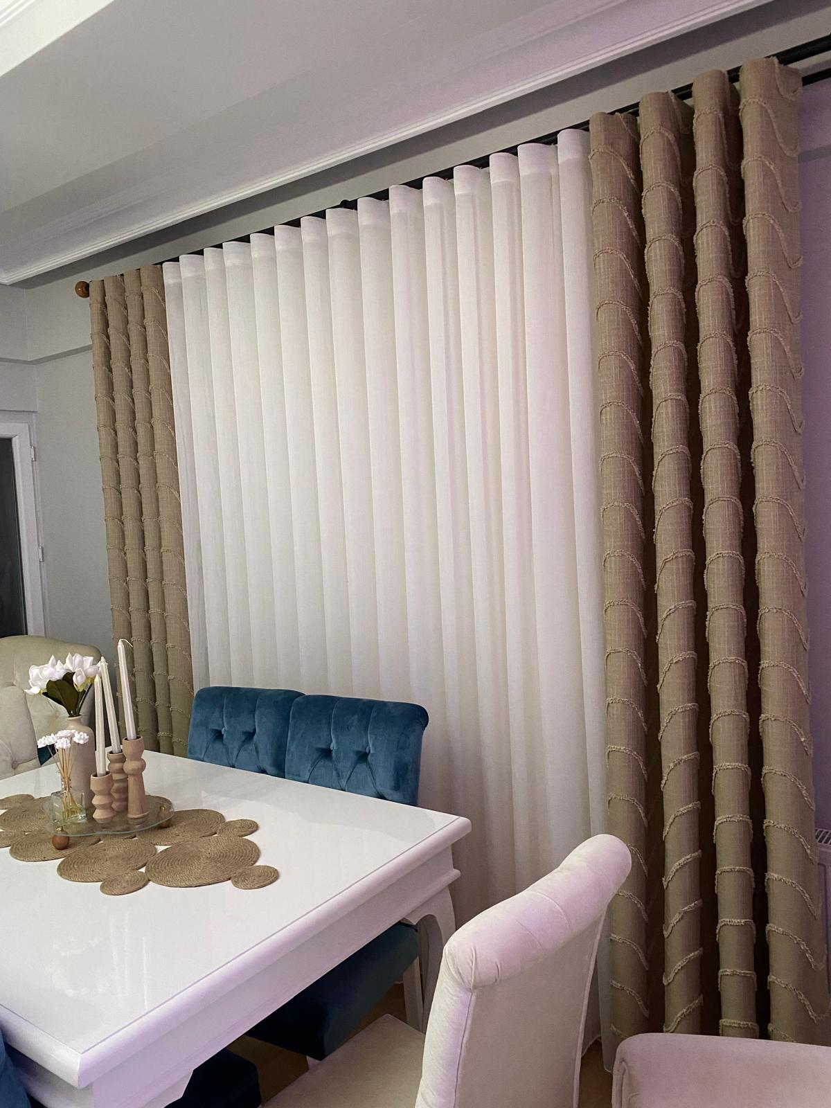 Fon Perdeler: Tül perdelerle kombinlenerek hem dekoratif bir şıklık hem de gece kullanımında mahremiyet sunar.